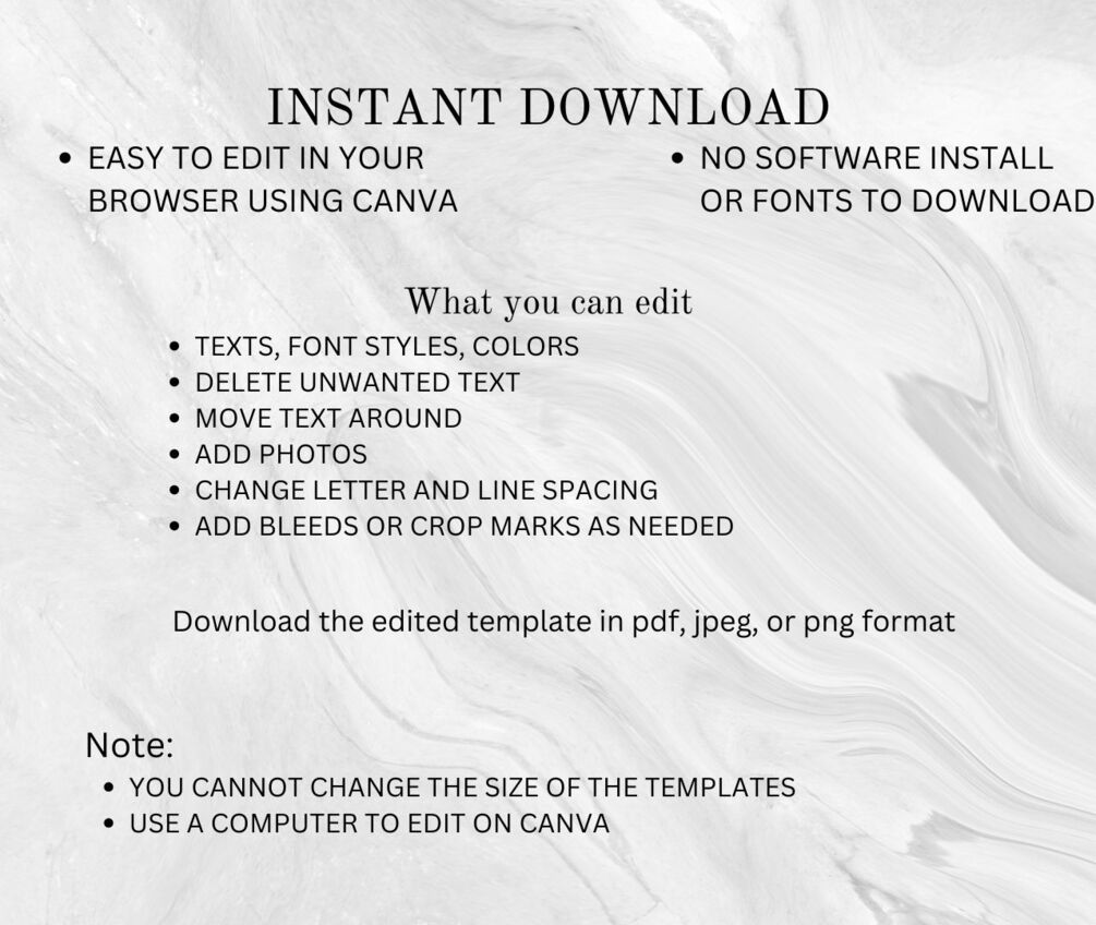 This seating chart template features a clean black and white minimalist design with accents of modern calligraphy and is perfect for you and your future partner. After you place your order, you will receive an email with the access link to your self-editable template where you will be able to customize all your own details on canva. Canva is an online photo editor that allows you to completely personalize your printable directly in your browser. There is no need to download any fonts or software.
