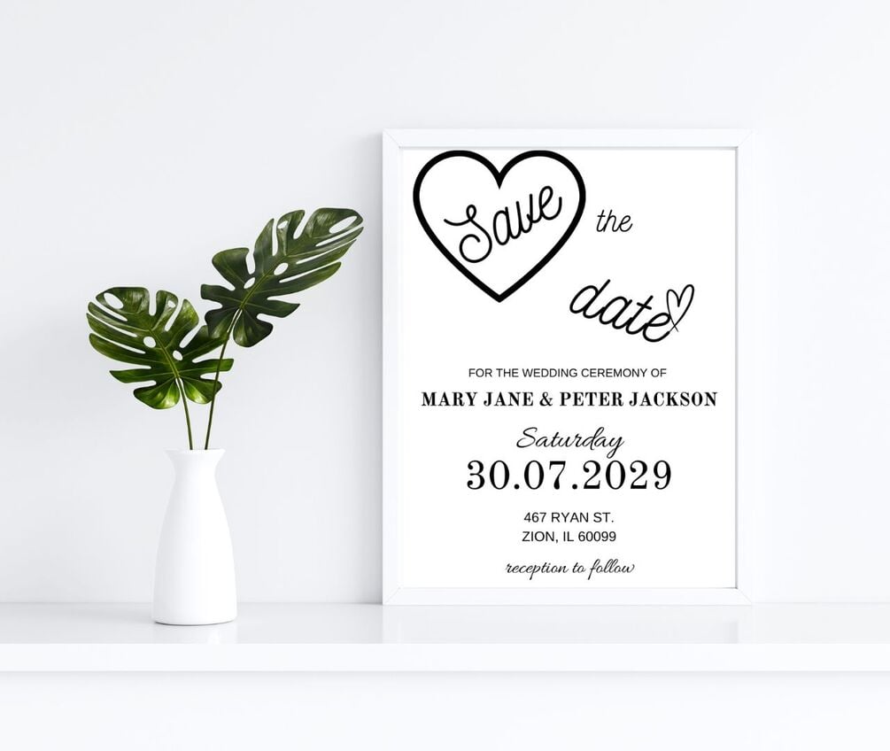 This save the date template features a clean black and white minimalist design with accents of modern calligraphy and is perfect for you and your future partner. After you place your order, you will receive an email with the access link to your self-editable template where you will be able to customize all your own details on canva. Canva is an online photo editor that allows you to completely personalize your printable directly in your browser. There is no need to download any fonts or software.