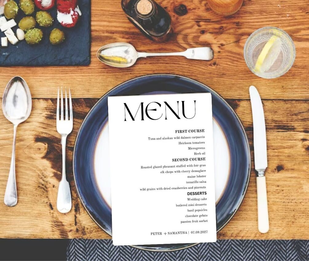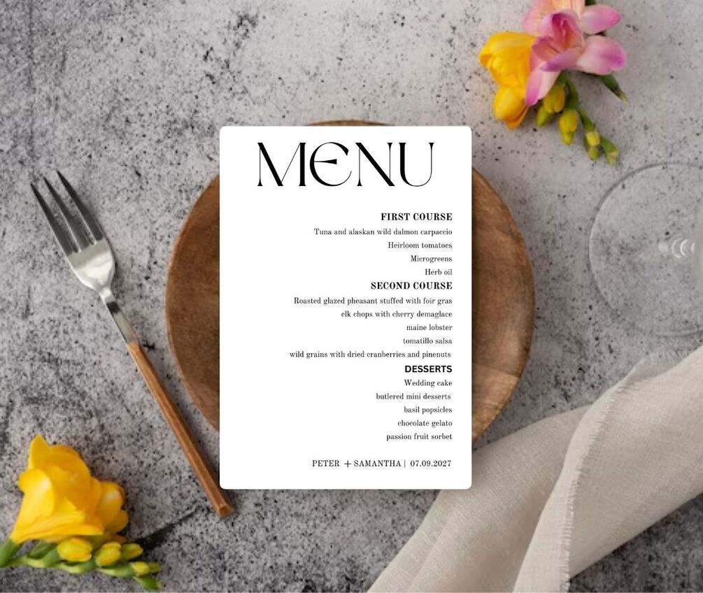 This wedding menu template features a clean black and white minimalist design with accents of modern calligraphy and is perfect for you and your future partner. After you place your order, you will receive an email with the access link to your self-editable template where you will be able to customize all your own details on canva. Canva is an online photo editor that allows you to completely personalize your printable directly in your browser. There is no need to download any fonts or software.
