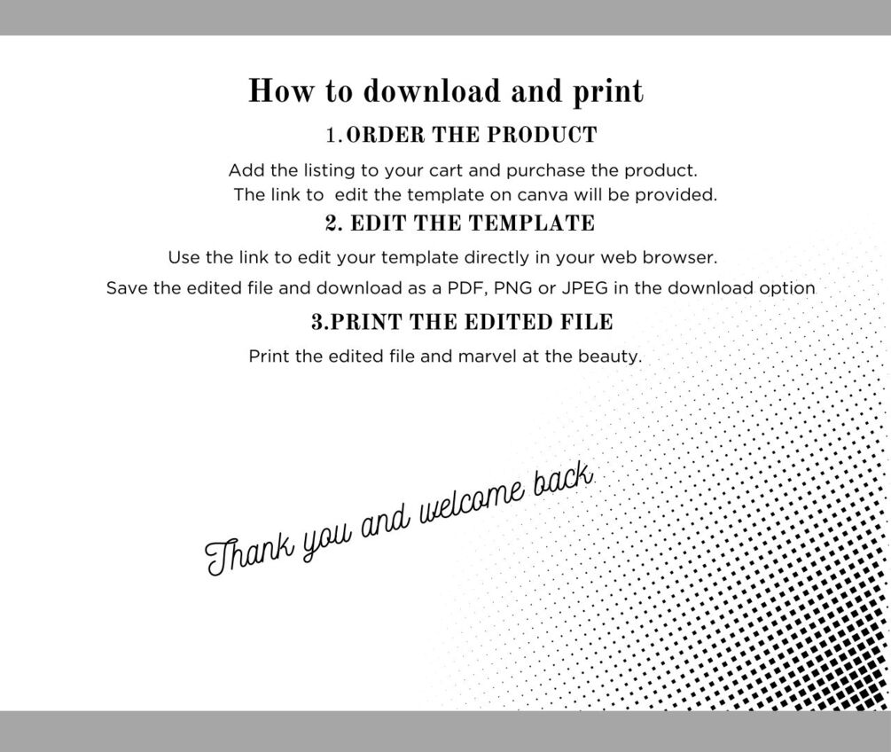 This place card template features a clean black and white minimalist design with accents of modern calligraphy and is perfect for you and your future partner. After you place your order, you will receive an email with the access link to your self-editable template where you will be able to customize all your own details on canva. Canva is an online photo editor that allows you to completely personalize your printable directly in your browser. There is no need to download any fonts or software.